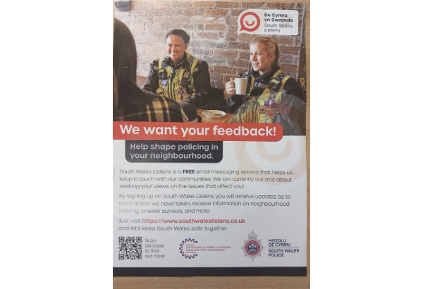 BYDD PCSO ANDY BROWN YNG NGORSAF HEDDLU REYNOLDSTON RHWNG 09; 00-10; 30 AWR AR DDYDD SADWRN 6 RHAG A DYDD SUL 7FED RHAGFYR. OS HOFFAI UNRHYW DRIGOLION GŴYR GOFRESTRU I'R GWASANAETH, GALWCH HEIBIO A CHAEL SGWRS. BYDD Y GWASANAETH NEGESEUON YN GALLUOGI SWYDDOGION LLEOL I YMGYSYLLTU'N UNIONGYRCHOL Â'R GYMUNED DRWY E-BOST, GAN EU CYNGHORI AM UNRHYW DUEDDIADAU TROSEDDU SY'N DIGWYDD YNG NGŴYR YN OGYSTAL AG I NI HYSBYSEBU EIN HOLL YMRWYMIADAU FEL PANED GYDA CHOPR A CHYMORTHFEYDD HEDDLU YN YSTOD MISOEDD YR HAF. DILYNWCH Y DDOLEN AR Y POSTER ATODEDIG BYDD HYN YN RHOI MWY O FANYLION I CHI MEWN PERTHYNAS Â'R